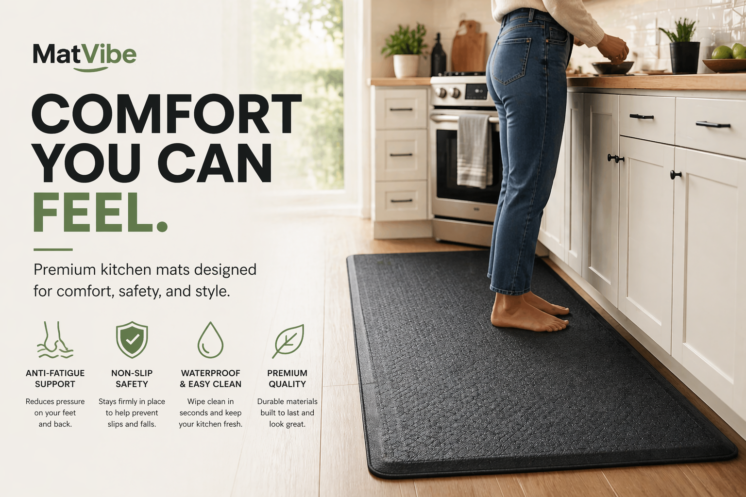 MatVibe mats are designed with anti-fatigue support, non-slip grip, and easy-clean materials — giving you comfort, safety, and style in one simple upgrade.